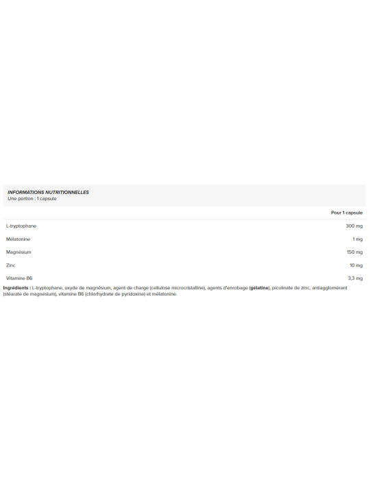Ingredients: L-tryptophan, magnesium oxide, bulking agent (microcrystalline cellulose), glazing agent(gelatin), zinc picolinate, anti-caking agent (magnesium stearate), vitamin B6 (pyridoxine hydrochloride) and melatonin.