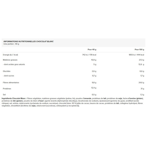 Ingredients Dark Chocolate : Vegetable fiber, vegetable fat (palm, linseed), almond powder, milk protein, soy protein, oat flour(gluten), wheat protein(gluten), egg white powder, raising agents (disodium diphosphate, sodium bicarbonate), thickener (guar gum), acidifier (citric acid), salt, flavor, sweeteners (sodium cyclamate, sucralose), dark chocolate 30% [pâte de cacao, beurre de cacao, protéines de lait, collagène hydrolysé, fibres végétales, poudre de cacao maigre, émulsifiant (lécithine de soja), édulcorant (sucralose), antioxydant (α-tocophérol)].