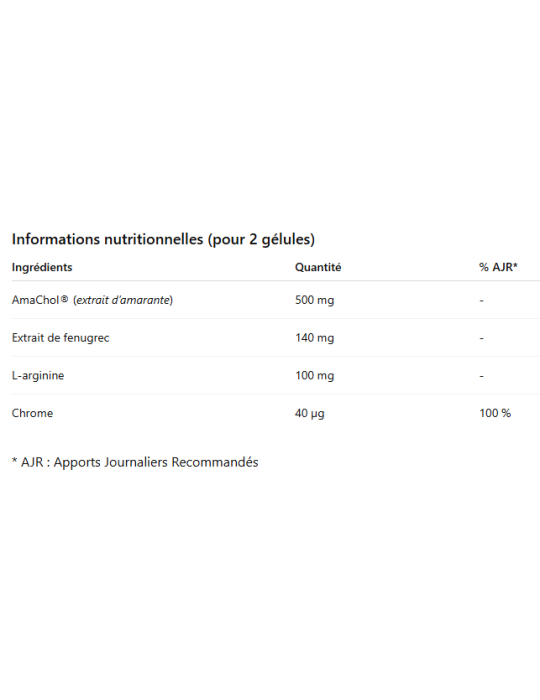 Ingredients : AmaChol® (amaranth extract) - Capsule shell: hypromellose, colorant (copper-chlorophyll complex and chlorophyllins) - Fenugreek extract (Trigonella foenum-graecum L.) - L-arginine - Rice flour - Chromium chloride.