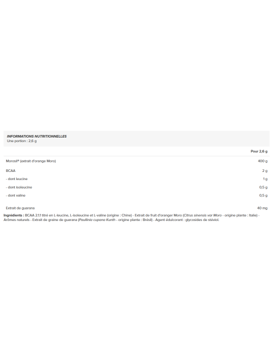 Ingredients : BCAA 2.1.1 titrated in L-leucine, L-isoleucine and L-valine (origin: China) - Moro orange fruit extract(Citrus sinensis var Moro - plant origin: Italy) - Natural flavours - Guarana seed extract(Paullinia cupana Kunth - plant origin: Brazil) - Sweetening agent: steviol glycosides.