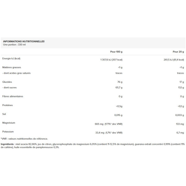 Ingredients: acacia honey 82.66%, lemon juice, magnesium glycerophosphate 6.05% (contains 11-12.5% magnesium), guarana extract concentrate 0.99% (contains 11% caffeine), grapefruit essential oil 0.3%.