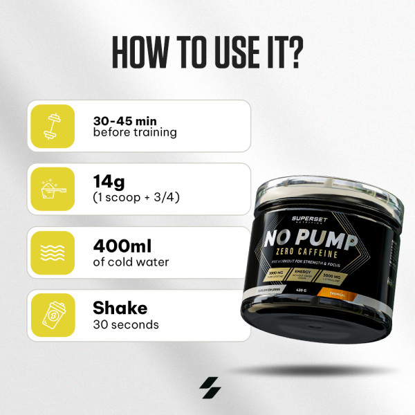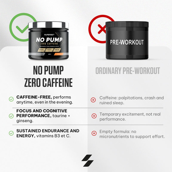 Designed by the nutritional specialists of the French brand Superset Nutrition for maximum results during your training sessions, No Pump Zero Caffeine (420g) will enable you to continue to perform without the recognized constraints of caffeine.