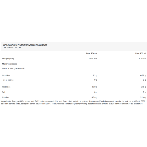 Ingredients - green tea and lemon-mint : carbonated water, humectant: E422, natural flavors (green tea, lemon-mint), guarana seed extract (Paullinia cupana), matcha powder, acidifier: E330, bovine collagen, sweetener: E955.