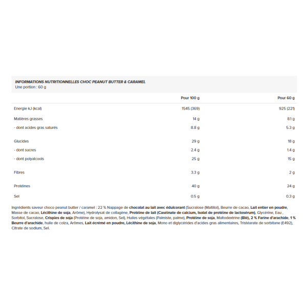 Ingredients - Choc Peanut Butter & Caramel : 22% milk chocolate coating with sweetener (sucralose (maltitol), cocoa butter, whole milk powder, cocoa mass, soy lecithin, flavouring), collagen hydrolysate, milk protein( calciumcaseinate, whey protein isolate), glycerine, water, sorbitol, sucralose, soy crispies ( soy protein, starch, salt), vegetable oils (palm kernel, palm), soy protein, maltodextrin(wheat), 2% peanut flour, 1% peanut butter, rapeseed oil, flavoring, skim milk powder, soy lecithin, mono and diglycerides of edible fatty acids, sorbitan tristearate (e492), sodium citrate, salt.