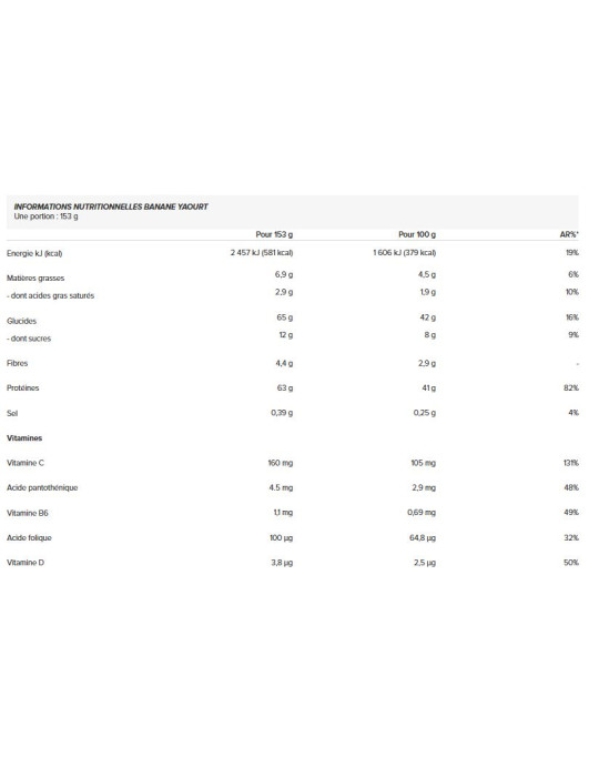 Ingredientes yogur de plátano :Concentrado de proteínas de suero de leche 33%, maltodextrina 19%, harina de copos avena 13%, cacao en polvo bajo en grasa, concentrado de proteínas lácteas leche 4,8%, dextrosa 3,3%, hidrolizado de proteínas de vacuno 2%, creatina monohidrato 1,1%, creatina anhidra 1%, harina almendra, harina quinoa, almidón de maíz 0,7%, isomaltulosa 0,7%, taurina, polvo de bayas de goji, L-glutamina, caseinato cálcico instantáneo (leche) (caseinato de calcio [leche], emulgente (mono - y diglicéridos de ácidos grasos)), emulgente (lecitinas), L-arginina 0,4%, aislado proteico instantáneo de suero de leche (leche) 0,3% [aislado de proteínas de suero de leche (leche), emulgente [soja]), L-leucina, mezcla de harinas (salvado avena, quinoa, amaranto, trigo sarraceno, mijo) 0,3%, polvo de bayas de acai, dextrina cíclica (maltodextrina) 0,3%, proteína de arroz, espesante (goma xantana), L-valina, L-soleucina, antiaglomerante (dióxido de silicio), edulcorantes (sucralosa, acesulfamo K), vitamina C (ácido L-ascórbico), L-tirosina, L-treonina, bitartrato de colina 0,7%, hidrocloruro de L-ornitina, L-carnitina L-tartrato, preparado de extracto de frutos de jengibre [extrait de rhizome de gingembre (Zingiber officinale), maltodextrine], betaína 2,2%, acetil L-carnitina, L-glutation, ácido pantoténico (D-pantotenato cálcico), Bioperine extracto de fruto de pimienta negra (Piper nigrum) 0,001%, vitamina D (colecalciferol), vitamina B6 (clorhidrato de piridoxina), ácido fólico (L-metilfolato cálcico).