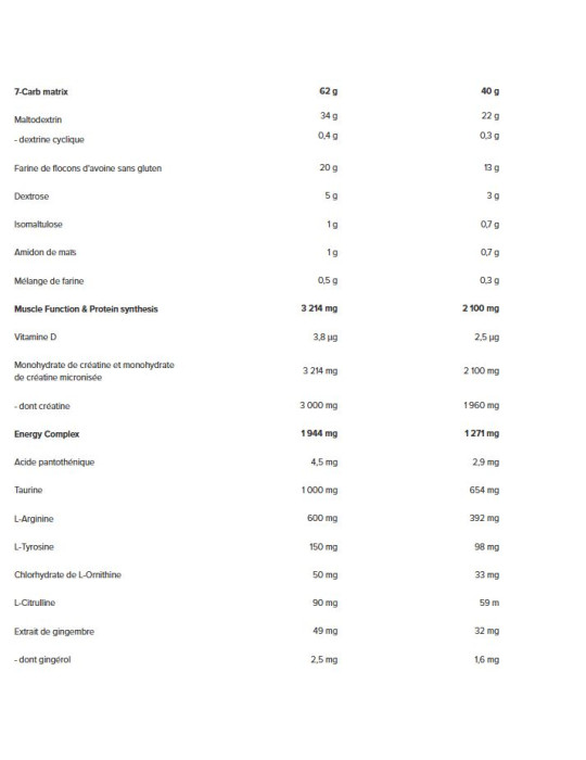 Ingredientes Chocolate blanco crujiente :concentrado de proteína de suero (leche) 33%, maltodextrina 22%, harina de copos de avena 13%, aromas, concentrado de proteína de leche 4,8%, dextrosa 3,3%, proteína de vacuno hidrolizada 2,0%, monohidrato de creatina 1,1%, creatina anhidra 1,0%, harina de almendras, harina de quinoa, almidón de maíz 0,7%, isomaltulosa1 0,7%, taurina, polvo de bayas de goji, L-glutamina, caseinato de calcio instantáneo (leche) [caséinate de calcium (lait), émulsifiant (mono- et diglycérides d'acides gras) ], emulgente (lecitinas), L-arginina 0,4%, aislado instantáneo de proteína de suero (leche) 0,3% {isolat de protéines de lactosérum (lait), émulsifiant [lécithines (soja)]}, l-Leucina, mezcla de harinas (salvado de avena, quinoa, amaranto, trigo sarraceno, mijo) 0,3%, polvo de bayas de acai, dextrina cíclica (maltodextrina) 0,3%, proteína de arroz, chocolate blanco en polvo (sacarosa, manteca de cacao, leche entera en polvo), espesante (goma xantana), L-Valina, L-Isoleucina, antiaglomerante (dióxido de silicio), vitamina C (ácido L-ascórbico), L-tirosina, edulcorantes (sucralosa, acesulfamo K), L-treonina, bitartrato de colina 0,07%, hidrocloruro de L-lisina, glicina, L-alanina, L-fenilalanina, inositol, L-citrulina, L-histidina, L-metionina, clorhidrato de L-ornitina, L-carnitina L-tartrato, preparado de extracto de jengibre [extrait de rhizome de gingembre (Zingiber officinale), maltodextrine], betaína 0,02%, acetil-L-carnitina, L-glutatión, ácido pantoténico (D-pantotenato, calcio), BioPerine® extracto de pimienta negra (Piper nigrum) 0,001%, vitamina D (colecalciferol), vitamina B6 (clorhidrato de piridoxina), ácido fólico (calcio-L-metilfolato). 1La isomaltulosa es una fuente de glucosa y fructosa.