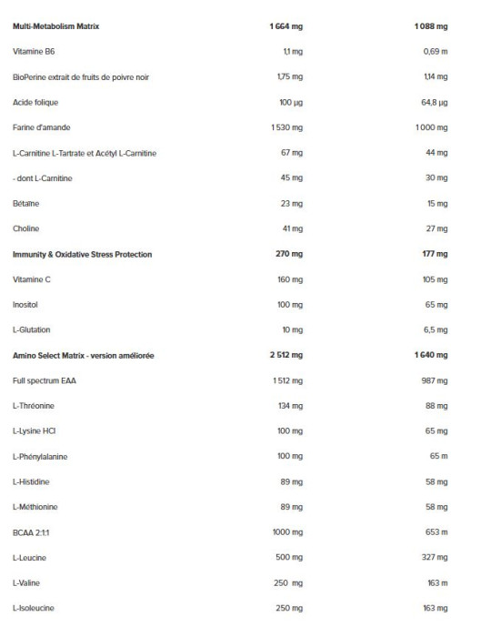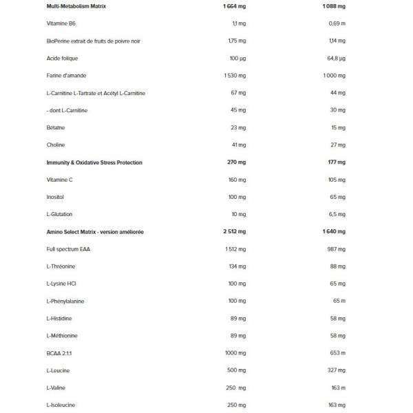 | Amino Select Matrix - versión mejorada | 2548 mg | 1663 mg | |