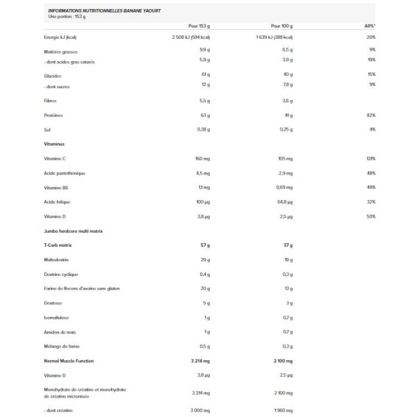 JUMBO HARDCORE contiene 5 fuentes de proteínas de absorción rápida a lenta (suero de leche, aislado de suero de leche, caseína micelar, hidrolizado de carne de vacuno, proteína de arroz), 7 tipos de hidratos de carbono para un almacenamiento óptimo de glucógeno (avena, modcarb, ciclo-dextrina, palatinosa, maíz ceroso, maltodextrina y dextrosa), una matriz de 6 creatinas incluyendo CreaPep, que favorece la secreción de insulina y por lo tanto el almacenamiento de creatina en el músculo. Además, JUMBO HARDCORE no contiene azúcares simples
