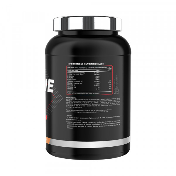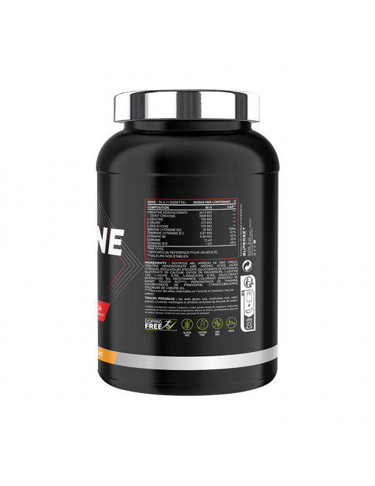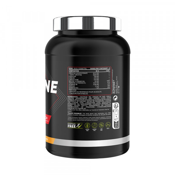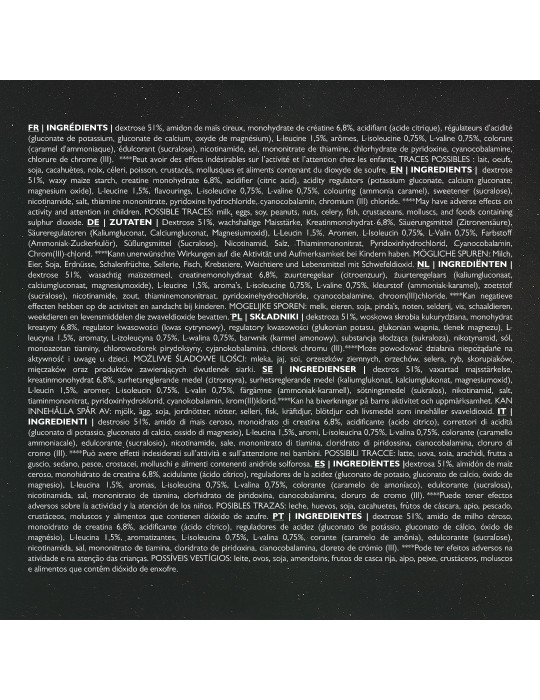 Ingredientes naranja: Dextrosa 48%, almidón de maíz ceroso, creatina monohidrato 6,8%, aromas, acidulante (ácido cítrico), reguladores de la acidez (gluconato de potasio, gluconato de calcio, óxido de magnesio), L-leucina 1,5%, L-valina 0,75%, L-isoleucina 0,75%, edulcorante (sucralosa), sal, nicotinamida, colorante (Ponceau 4R, Sunset Yellow FCF)***, mononitrato de tiamina, clorhidrato de piridoxina, cianocobalamina, cloruro de cromo (III). ***Puede tener efectos adversos sobre la actividad y la atención de los niños.