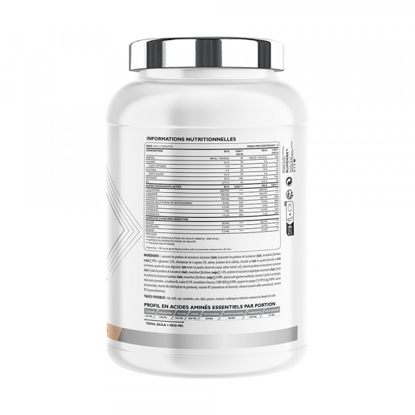 Ingredientes ChoconutConcentrado instantáneo de proteína de suero (leche) {concentrado de proteínas de trigo (leche), emulgente [lecitinas (soja)]} 77%, cacao desgrasado en polvo 9%, L-glutamina 5,5%, aromas (contiene cafeína), clorhidrato de L-arginina 2%, aislado instantáneo de proteína de suero (leche) {aislado de proteína de suero (leche), emulgente [lecitinas (soja)]} 1,4%, proteína de suero hidrolizada instantánea (leche) {aislado de proteína de suero hidrolizada (leche), emulgente [lecitinas (soja)]} 0,48%, espesante (goma xantana), vitamina C (ácido L-ascórbico), edulcorantes (sucralosa, acesulfamo K), inulina 0,31%, chocolate con leche en polvo [chocolat au lait (saccharose, cacao dégraissé en poudre, lait entier en poudre, beurre de cacao), arôme naturel, sel] 0,2%, bromelina de piña (1200 GDU/g) 0,04%, papaína de papaya (1,5 FIP U/ mg) 0,04%, niacina (nicotinamida), vitamina B6 (clorhidrato de piridoxina), vitamina B1 (mononitrato de tiamina), vitamina B12 (cianocobalamina).