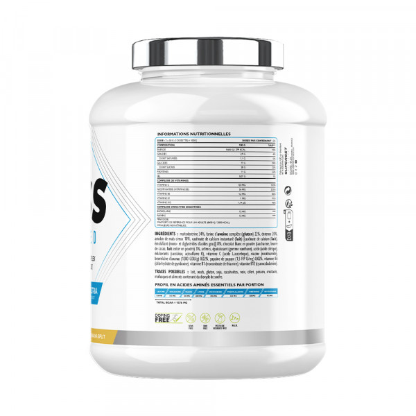 Ingredientes Chocolate : maltodextrina 34%, harina de avena integral (gluten) 20%, dextrosa 20%, almidón de maíz ceroso 10%, caseinato cálcico instantáneo (leche) [caseinato cálcico (leche), emulgente (mono- y diglicéridos de ácidos grasos)] 8%, cacao desgrasado en polvo 5%, aromas, espesante (goma xantana), edulcorantes (sucralosa, acesulfamo K), vitamina C (ácido L-ascórbico), niacina (nicotinamida), bromelina de piña (1200 GDU/g) 0,02%, papaína de papaya (1,5 FIP U/mg) 0,02%, vitamina B6 (clorhidrato de piridoxina), vitamina B1 (mononitrato de tiamina), vitamina B12 (cianocobalamina).