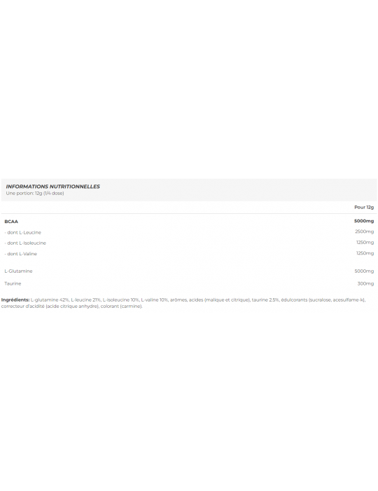 IngredientesLimón: L-glutamina 42%, L-leucina 21%, L-isoleucina 10%, L-valina 10%, aromas, taurina 2,5%, edulcorantes (sucralosa, acesulfamo-k), acidulantes (ácido málico, ácido cítrico), colorante (riboflavinas).