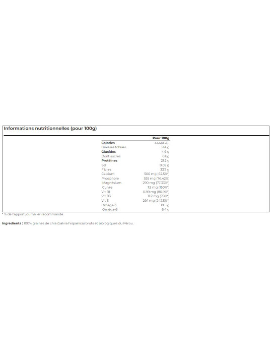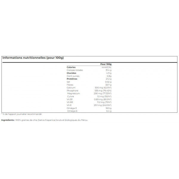 % de la ingesta diaria recomendada Ingredientes: 100% semillas de chía (Salvia hispanica) crudas y ecológicas de Perú.