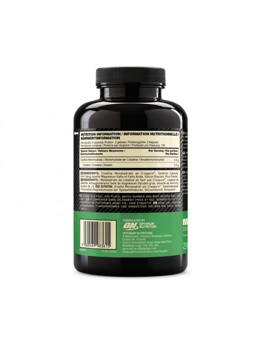 Optimum Nutrition ha desarrollado la fórmula de Creatine 2500 para que se asimile lo más fácilmente posible, gracias a la rápida desintegración de las cápsulas y a su eficaz absorción. Su fórmula en cápsulas permite una dosificación perfecta para un efecto óptimo.