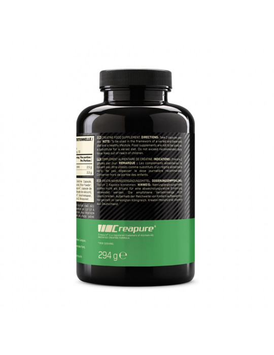 Otros ingredientes: Creapure® creatina monohidrato, cápsula de gelatina, antiaglomerantes (sales magnésicas de ácidos grasos, dióxido de silicio), polvo de arroz.