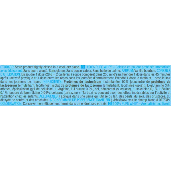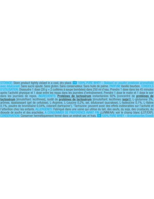 Ingredientes - Aroma de vainillaProteínassuero de lecheInstant 92% {concentrado de proteína desuero de leche [émulsifiant : lécithines], aislado de proteínasuero de leche[emulgente: lecitinas (soja)]}, L-glutamina 3%, aromas, espesante (gel de celulosa), L-arginina, L-leucina 0,2%, sal, edulcorante (sucralosa), L-isoleucina 0,1%, L-valina 0,1%, bromelaína en polvo 0,04%, colorante (tartrazina¹).