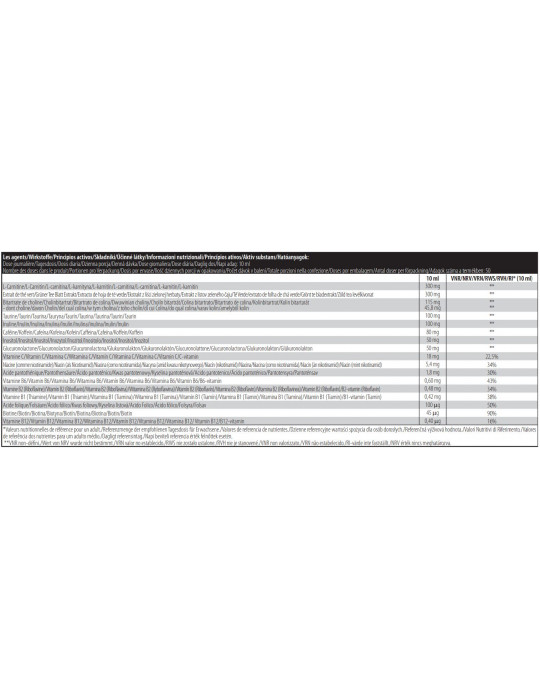 Los complementos alimenticios deben utilizarse como parte de un estilo de vida saludable y no como sustitutos de una dieta variada y equilibrada. No superar la dosis diaria recomendada. Mantener fuera del alcance de los niños. [800 mg caféine/100 ml produit, 80 mg caféine/dose (10 ml)] Alto contenido en cafeína . No recomendado para mujeres embarazadas o en período de lactancia ni para adolescentes. No recomendado para personas sensibles a la cafeína o que padezcan enfermedades cardiovasculares o hipertensión arterial. No se recomienda su consumo en caso de enfermedad subyacente o cuando se esté tomando medicación. Conservar en lugar fresco y seco, bien cerrado, en su envase original, al abrigo del calor y la luz.