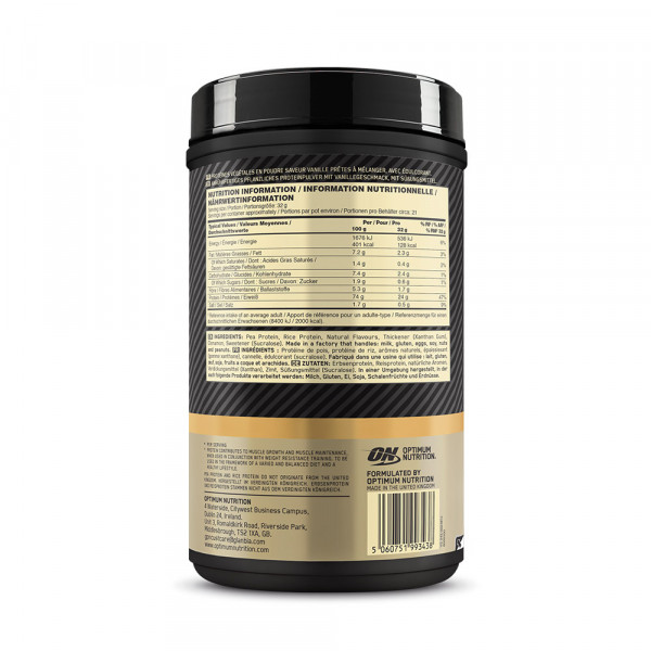Descubre la nueva Gold Standard 100% Plant. Idealmente dosificada con 24g de proteína 100% vegetal por dosis, es probablemente una de las proteínas vegetales más ricas.