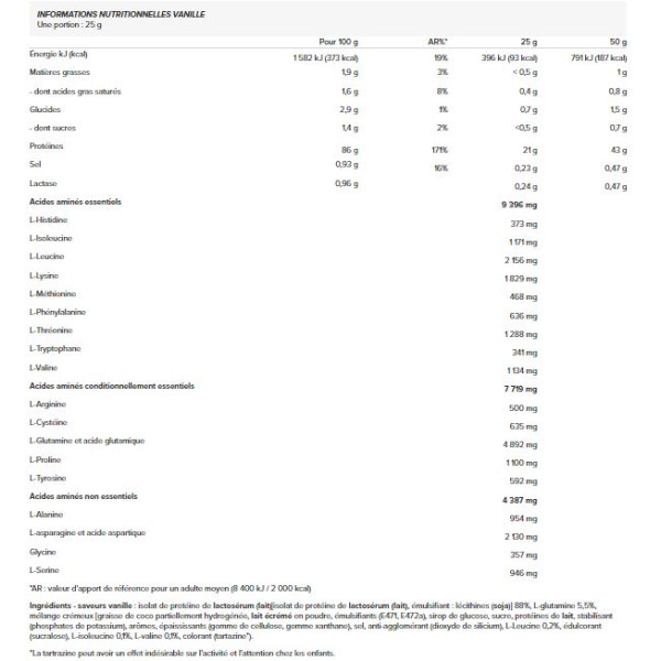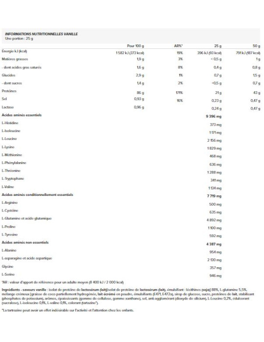 Ingredientes - Aroma de vainillaAislado de proteínasuero de leche(leche)[aislado de proteína desuero (leche), emulgente: lecitinas (soja)] 88%, L-glutamina 5,5%, mezcla cremosa [grasa de coco parcialmente hidrogenada,leche desnatadaPolvo, emulgentes (E471, E472a), jarabe de glucosa, azúcar, proteínas lácteasleche, estabilizante (fosfatos potásicos), aromas, espesantes (goma de celulosa, goma xantana), sal, antiaglomerante (dióxido de silicio), L-leucina 0,2%, edulcorante (sucralosa), L-isoleucina 0,1%, L-valina 0,1%, colorante (tartazina*).