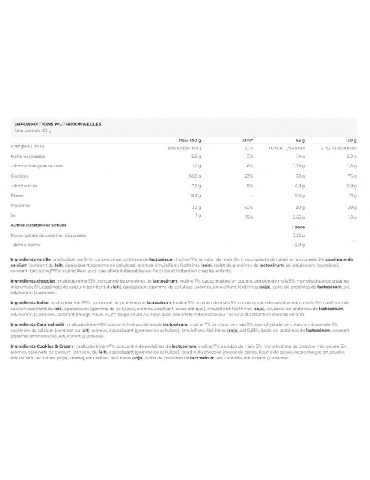 Ingredientes vainilla: maltodextrina 54%, concentrado de proteína de suero, inulina 7%, almidón de maíz 5%, monohidrato de creatina micronizado 5%, caseinato de calcio (contiene leche), espesante (goma de celulosa), aromas, emulgente: lecitina(soja), aislado de proteína de suero, sal, edulcorante (sucralosa), colorante (tartrazina)*.*Tartrazina: puede tener efectos adversos sobre la actividad y la atención de los niños.
