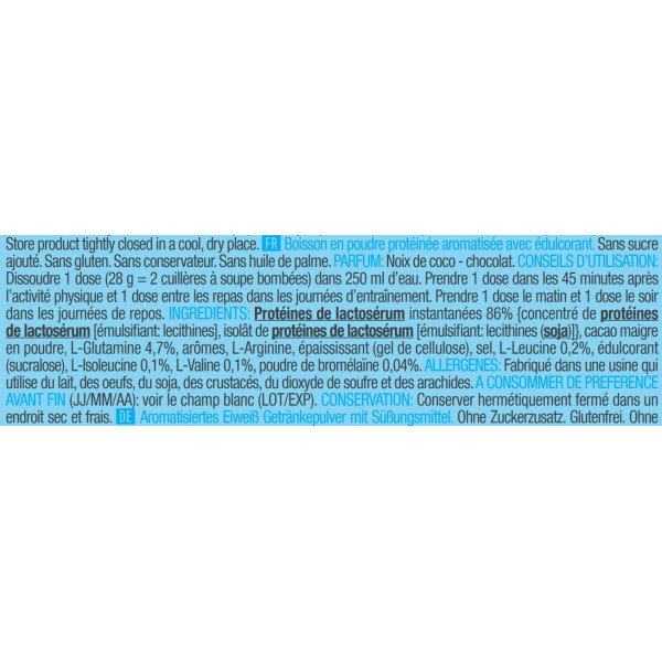 Ingredientes Chocolate con coco proteínas de suero de lecheInstant 86% {concentradoproteínas de suero [émulsifiant : lécithines], aislado de proteína suero de leche[emulgente: lecitinas (soja)]}, cacao en polvo bajo en grasas, L-glutamina 4,7%, aromas, L-arginina, espesante (goma de celulosa), sal, L-leucina 0,2%, edulcorante (sucralosa), L-isoleucina 0,1%, L-valina 0,1%, bromelaína en polvo 0,04%.