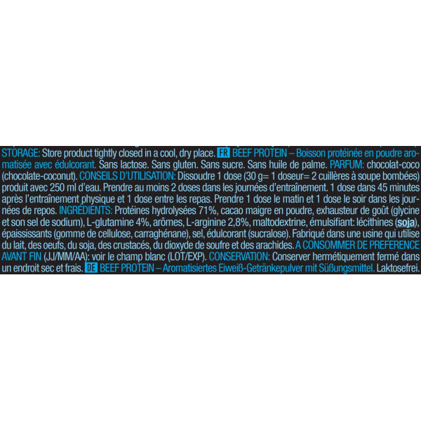 Ingredientes choco-coco : Proteína hidrolizada 71%, cacao en polvo bajo en grasa, potenciador del sabor (glicina y su sal de sodio), L-glutamina 4%, aromas, L-arginina 2,8%, maltodextrina, emulgente: lecitina(soja), espesantes (goma de celulosa, carragenina), sal, edulcorante (sucralosa).
