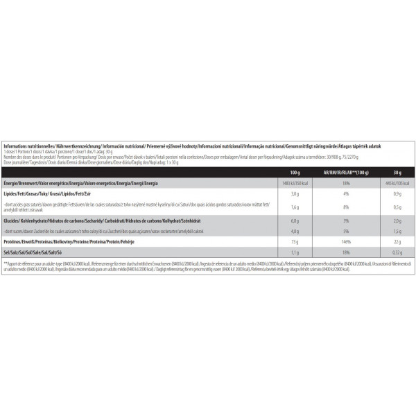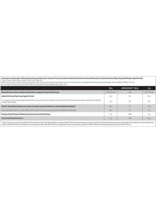 Ingredientes sabor chocolate : caseinato de calcio (contiene leche) 85%, cacao en polvo bajo en grasa, L-glutamina 5%, agente desnatador [grasa de coco parcialmente hidrogenada, leche en polvo desnatada, emulgentes (E471, E472a), jarabe de glucosa, sacarosa, proteína de leche, estabilizador (fosfatos de potasio), antiaglomerante (fosfatos de calcio)], aromas, espesante (goma de celulosa), sal, antiaglomerante (dióxido de silicio), edulcorante (sucralosa).