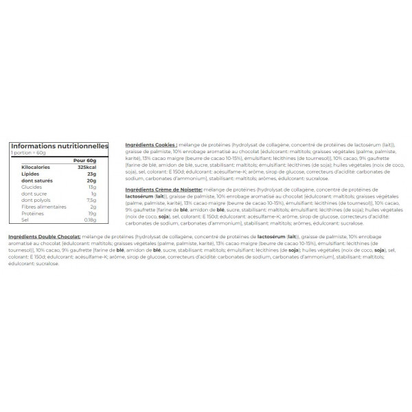 [édulcorant: maltitols; graisses végétales (palme, palmiste, karité), 13% cacao maigre (beurre de cacao 10-15%), émulsifiant: lécithines (de tournesol)]Ingredientes Chocolate doble: mezcla de proteínas (hidrolizado de colágeno, concentrado de proteína de suero(leche)), grasa de palmiste, 10% de cobertura aromatizada de chocolate , 10% de cacao, 9% de barquillo[harina de trigo, almidón de trigo, azúcar, estabilizador: maltitoles; emulgente: lecitinas (soja); aceites vegetales (coco, soja), sal, colorante: E 150d; edulcorante: acesulfamo-K; aroma, jarabe de glucosa, reguladores de la acidez: carbonatos de sodio, carbonatos de amonio], estabilizador: maltitoles; edulcorante: sucralosa.