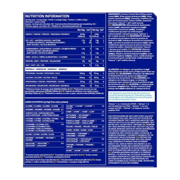 Ingredientes Vainilla: mezcla de proteínas premium [ aislado de proteína de suero(leche), hidrolizado de proteína de suero(leche), concentrado de proteína de suero(leche)], aromas, estabilizadores (goma guar, goma xantana), cloruro sódico, edulcorante (sucralosa), Tolerase™ L (lactosa con pH estable).
