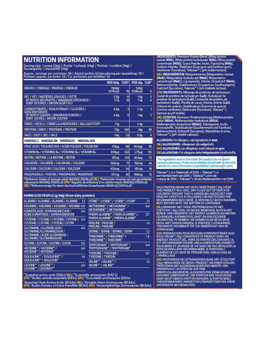 Ingredientes Chocolate: mezcla de proteínas premium [ aislado de proteína de suero(leche), hidrolizado de proteína de suero(leche), concentrado de proteína de suero(leche)], cacao en polvo, aromas, cloruro sódico, estabilizadores (goma guar, goma xantana), edulcorante (sucralosa), Tolerase™ L (lactosa con pH estable).