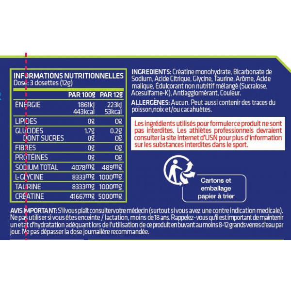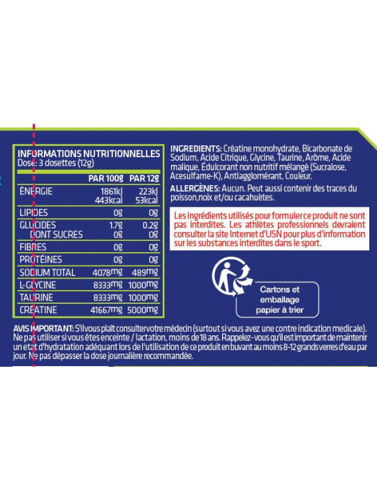 Ingredientes : Creatina monohidrato, Bicarbonato sódico, Ácido cítrico, Glicina, Taurina, Aroma, Ácido málico, Edulcorante (Sucralosa, Acesulfamo-K), Antiaglomerante, Colorante.