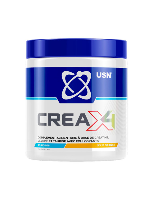 USN Crea X4, en forma de polvo con sabor a naranja, es fácil de tomar. Mejora la potencia muscular, la resistencia y la recuperación, así como la contracción muscular en series cortas sucesivas de ejercicios muy intensos. Permite una asimilación rápida de la mezcla de 3 creatinas (monohidrato, piruvato y citrato), ya que es efervescente.