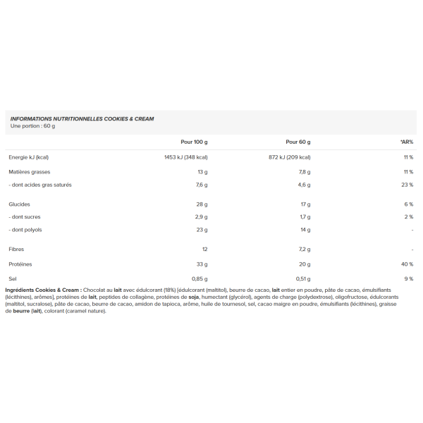 Ingredientes Cookies & Cream :ChocolatelecheCon edulcorante (18%) [edulcorante (maltitol), manteca de cacao,lechePolvo, pasta de cacao, emulgentes (lecitinas), aromas], proteína deleche, péptidos de colágeno, proteínas desoja, humectante (glicerol), agente de carga (polidextrosa), oligofructosa, edulcorantes (maltitol, sucralosa), pasta de cacao, manteca de cacao, almidón de tapioca, aroma, aceite de girasol, sal, cacao en polvo bajo en grasa, emulgentes (lecitinas), grasa lácteamantequilla(ltiene), colorante (caramelo natural).