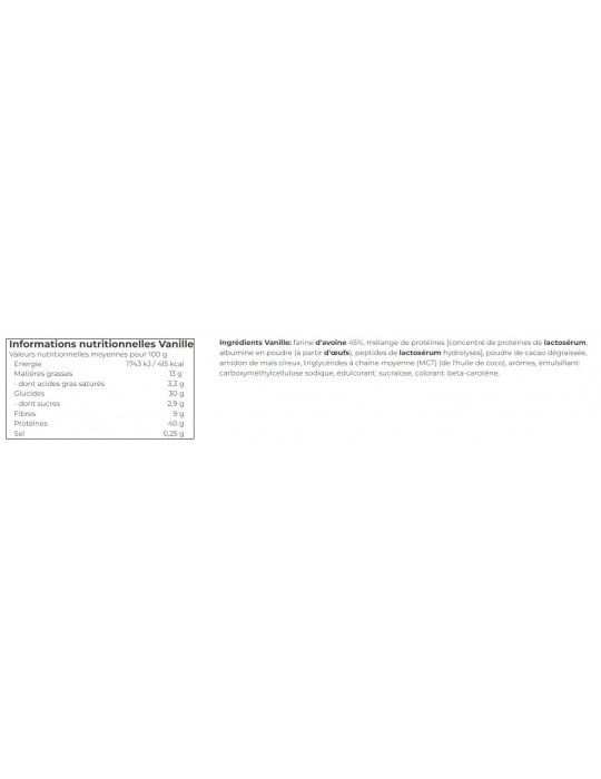 Ingredientes Naturaleza:Harinaavena45%, mezcla de proteínas [concentrado de proteínas lácteassuero de leche, albúmina en polvo (dede huevos), aislado de proteínas de suero de leche, péptidossuero de lecheHidrolizado], almidón de maíz ceroso, aceite vegetal [triglycérides à chaîne moyenne (MCT) (de l'huile de coco)], emulgente: carboximetilcelulosa sódica, edulcorante: sucralosa.