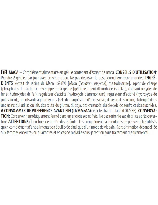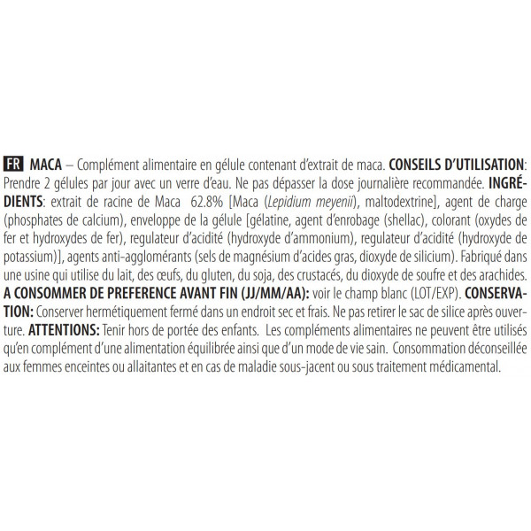 Ingredientes : [Maca (Lepidium meyenii), maltodextrine] [gélatine, agent d’enrobage (shellac), colorant (oxydes de fer et hydroxydes de fer), régulateur d’acidité (hydroxyde d’ammonium), régulateur d’acidité (hydroxyde de potassium)] Extracto de raíz de maca 62,8% , agente de carga (fosfatos de calcio), cubierta de la cápsula , antiaglomerantes (sales magnésicas de ácidos grasos, dióxido de silicio).
