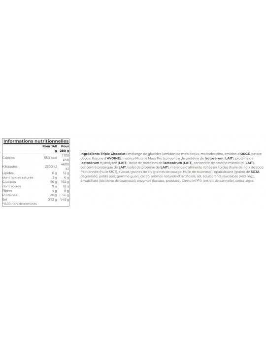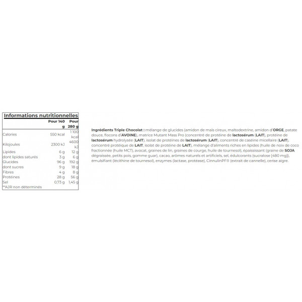 Ingredientes Triple Chocolate :mezcla de hidratos de carbono (almidón de maíz ceroso, maltodextrina, almidón de maíz)CEBADA, batata, copos deEVITAR), matriz Mutant Mass Pro (concentrado de proteínas de suero de leche (LECHE), proteína de suero de leche hidrolizado (LECHE), aislado de proteínas de suero de leche (LECHE), concentrado de caseína micelar (LECHE), concentrado de proteínas de LECHEAislado de proteína LECHE), mezcla de alimentos ricos en lípidos (aceite de coco fraccionado (aceite MCT), aguacate, semillas de lino, semillas de calabaza, aceite de girasol), agente espesante (maíz en grano, soja, aceite de soja) SOJA desgrasado, guisantes, goma guar), cacao, aromas naturales y artificiales, sal, edulcorantes (sucralosa[480 mg]), emulgente (lecitina de girasol), enzimas (lactasa, proteasa), CinnulinPF® (extracto de canela), cereza ácida.