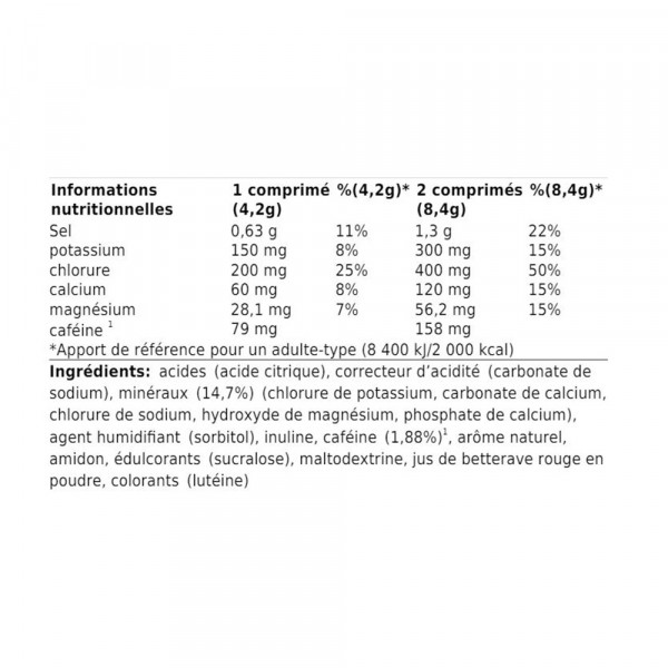IngredientesPomelo Rosa: Acidulante (ácido cítrico), regulador de la acidez (carbonato sódico), cloruro potásico, humectante (sorbitol), inulina, carbonato cálcico, cloruro sódico (CH: sal), cafeína (75 mg/tableta), hidróxido magnésico, aroma natural, fosfato tricálcico, almidón, edulcorante (sucralosa), maltodextrina, zumo de remolacha roja en polvo, colorante (luteína).