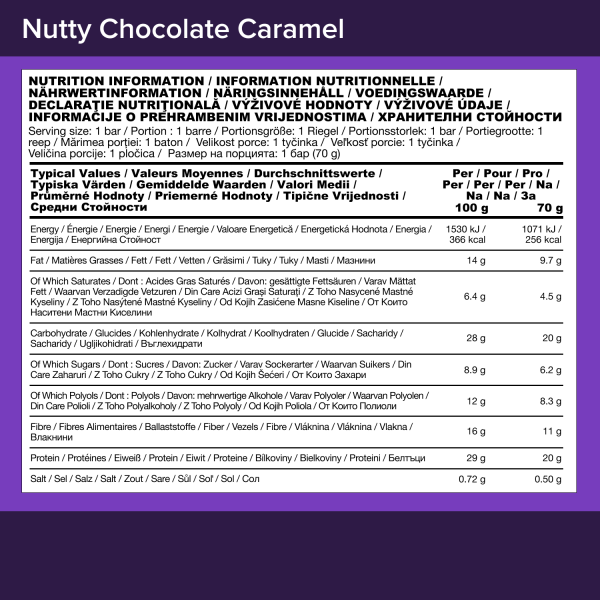 [LAIT]INGREDIENTES: Chocolate con proteína de leche (20%) (concentrado de proteína de LACTOSERUM, manteca de cacao, leche entera en polvo, edulcorante: maltitol; pasta de cacao, aroma natural de vainilla), chips de aislado de proteína de SOJA (13%), cobertura de aroma de caramelo (13%) (humectante: glicerol; maltodextrina, fructooligosacáridos, edulcorante: maltitol; aceite de coco, LECHE desnatada en polvo, colorante: E150a; emulgente: [LAIT][LAIT] lecitina de SOYA; sal, aromas naturales), fructooligosacáridos, pasas sultanas (8%), RAÍCES tostadas (7%), patatas fritas proteicas (7%) (aislado proteico de SOYA, almidón, sal), polidextrosa, aislado proteico de LACTOSERUM, isomaltooligosacáridos, humectante (glicerol), aceite de colza, aromas .