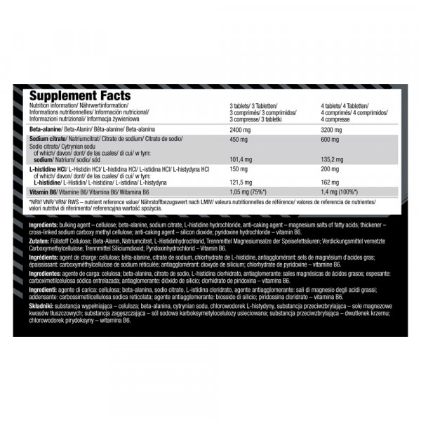 Ingredientes : 56,2% beta-alanina, agente de carga - celulosa microcristalina; 8,4% citrato de sodio, espesante - hidroxipropilmetilcelulosa, carboximetilcelulosa sódica reticulada; 2,8% hidrocloruro de L-histidina, antiaglomerante - dióxido de silicio, estearato de magnesio, hidrocloruro de piridoxina - vit. B6.