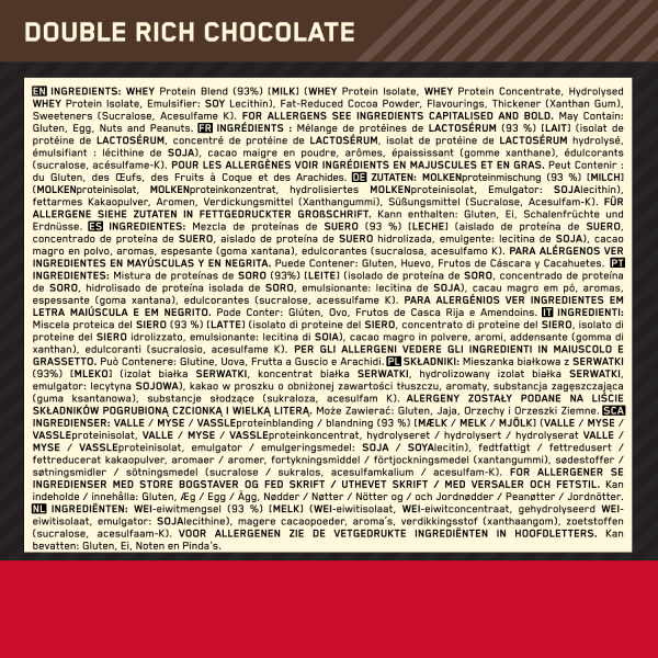 Ingredientes sabor chocolate: Mezcla de proteínas de suero (93%)[leche] (aislado de proteína de suero, concentrado de proteína de suero, aislado de proteína de suero hidrolizada, emulgente: lecitina de soja), cacao en polvo bajo en grasa, aromas, espesante (goma xantana), edulcorantes (sucralosa, acesulfamo K).