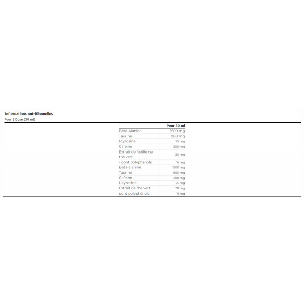 Ingredientes - Sabor pomelo: agua, beta-alanina, taurina, edulcorantes (sorbitol, acesulfamo K, sucralosa), acidulante (ácido cítrico), cafeína 0,67%, espesantes (goma de celulosa, goma xantana, goma guar), L-tirosina, conservador (ácido sórbico), extracto de hoja de té verde (Camellia sinensis) 0,07%, aroma, colorante (carmín).