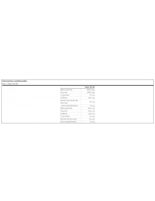 Los complementos alimenticios deben utilizarse como parte de un estilo de vida saludable y no como sustitutos de una dieta variada y equilibrada. No superar la dosis diaria recomendada. Mantener fuera del alcance de los niños. Alto contenido en cafeína [200 mg de caféine/dose (30ml), (667mg caféine/100ml produit)]. No recomendado para mujeres embarazadas o en período de lactancia ni para adolescentes. No recomendado para personas sensibles a la cafeína o que padezcan enfermedades cardiovasculares o hipertensión arterial. Conservar en lugar fresco y seco, bien cerrado, en su envase original, al abrigo del calor y de la luz.
