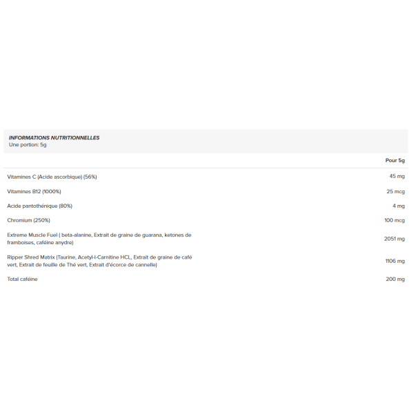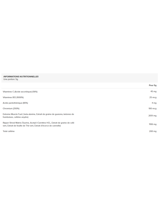 Ingredientes Fruit Punch : beta-alanina, taurina, ácidos (ácido cítrico, ácido málico), aromas, antiaglomerante (dióxido de silicio, silicato de calcio), extracto de semilla de guaraná, edulcorantes (sucralosa, acesulfamo K), cetonas de frambuesa, colorante (rojo remolacha), cafeína anhidra, clorhidrato de acetil L-carnitina, extracto de grano de café verde, extracto de hoja de té verde, extracto de corteza de canela, extracto de hoja de olivo, picolinato de cromo, vitaminas (ácido ascórbico, D-pantotenato cálcico, metilcobalamina).