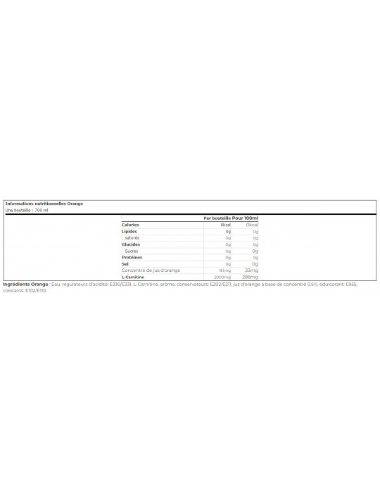 Ingredientes NaranjaAgua, reguladores de la acidez: E330/E331, L-Carnitina, aroma, conservantes: E202/E211, zumo de naranja a partir de concentrado 0,5%, edulcorante: E955, colorantes: E102/E110.