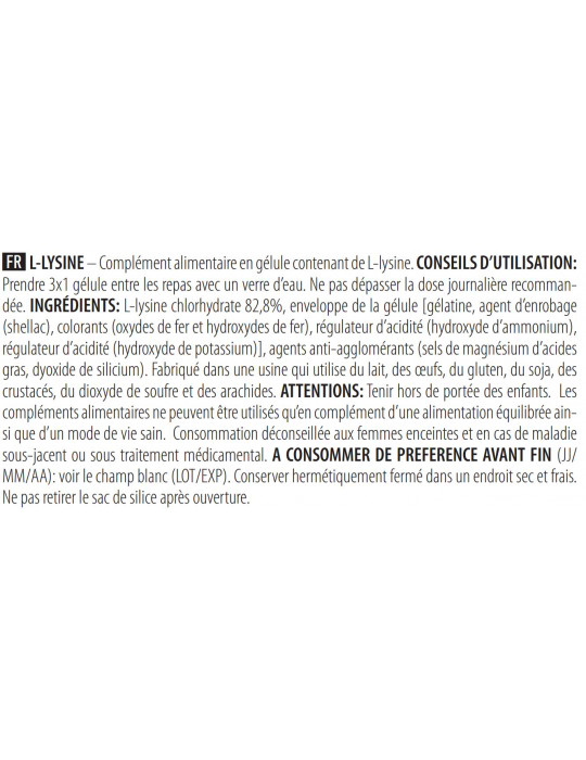[gélatine, agent d'enrobage (gomme laque), colorant (oxydes et hydroxydes de fer), régulateur d'acidité (hydroxyde d'ammonium), régulateur d'acidité (hydroxyde de potassium)]Ingredientes: L-Lisina clorhidrato 82,8%, cubierta de la cápsula , antiaglomerantes (sales de magnesio ácido, dióxido de silicio).