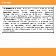 Ingredientes de naranja: agua, aminoácidos de cadena ramificada (L-leucina, L-isoleucina, L-valina), dióxido de carbono, ácido (ácido cítrico), lactato de magnesio, taurina, regulador de la acidez (citrato de potasio), aromas, beta-alanina, L-citrulina, L-glutamina, L-arginina, L-tirosina, cafeína natural, edulcorantes (sucralosa, acesulfamo-K), colorante (carotenos), extracto de té verde (camellia sinensis, hoja).