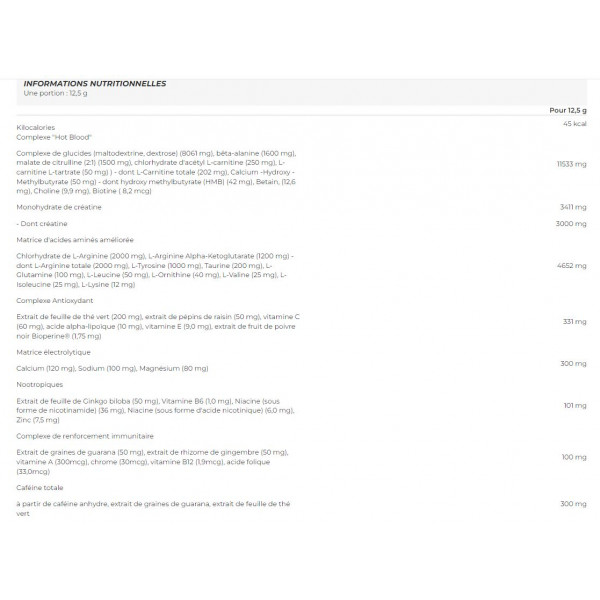 Ingredientes grosella negra baya de goji: maltodextrina, creatina monohidrato 13,6%, dextrosa, clorhidrato de L-arginina, beta-alanina, L-arginina alfa-cetoglutarato, agente de carga (polidextrosa), aromas, L-citrulina, L-tirosina, acidulante (ácido cítrico), ácido málico, sales cálcicas de ácido ortofosfórico, citrato de sodio, antiaglomerante (dióxido de silicio), cafeína anhidra 1,1%, clorhidrato de acetil-L-carnitina, edulcorantes (acesulfamo K, sucralosa), carbonato de magnesio, taurina, extracto de hoja de té verde, L-glutamina, colorantes (caramelo sulfito de amonio, carmín, azul brillante FCF), ácido L-ascórbico, L-leucina, clorhidrato de L-ornitina, regulador de la acidez (carbonatos de sodio), β-hidroxi β-metilbutirato cálcico, L-carnitina-L-tartrato, extracto de hoja de Ginkgo biloba, preparado de extracto de semilla de guaraná (extracto de guaraná, cafeína), extracto de rizoma de jengibre (extracto de jengibre, maltodextrina), nicotinamida, bisglicinato de zinc [bisglycinate de zinc, glycine, acidifiant (acide citrique), anti-agglomérant (dioxyde de silicium)], acetato de DL-alfa tocoferol [acétate de DL-alpha-tocophérol, anti-agglomérant (dioxyde de silicium)], L-valina, L-isoleucina, bitartrato de colina, extracto de pepitas de uva, clorhidrato de L-lisina, betaína, ácido nicotínico, acetato de retinilo [stabilisant (gomme arabique), acétate de rétinyle, antioxydant (alpha-tocophérol), anti-agglomérant (phosphates de calcium)], extracto de frutos de pimienta negra BioPerine®, clorhidrato de piridoxina, D-biotina, ácido pteroil monoglutámico, picolinato de cromo, cianocobalamina.