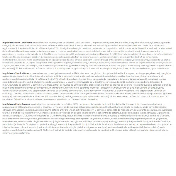Ingredientes de Tropical Punch: maltodextrina, monohidrato de creatina 13,6%, dextrosa, hidrocloruro de L-arginina, beta-alanina, agente de carga (polidextrosa), alfa-cetoglutarato de L-arginina, L-citrulina, L-tirosina, aroma, acidulante (ácido cítrico), ácido málico, sales cálcicas de ácido ortofosfórico, citrato de sodio, antiaglomerante (dióxido de silicio), cafeína anhidra 1,1%, clorhidrato de acetil-L-carnitina, carbonato de magnesio, edulcorantes (acesulfamo K, sucralosa), taurina, extracto de hoja de té verde, L-glutamina, ácido L-ascórbico, L-leucina, clorhidrato de L-ornitina, regulador de la acidez (carbonatos de sodio), β-hidroxi β-metilbutirato cálcico, L-carnitina-L-tartrato, extracto de hoja de Ginkgo biloba, preparado de extracto de semilla de guaraná (extracto de guaraná, cafeína), extracto de rizoma de jengibre (extracto de jengibre, maltodextrina), nicotinamida, colorantes (carmesí, Ponceau 4R)*, bisglicinato de zinc [bisglycinate de zinc, glycine, acidifiant (acide citrique), anti-agglomérant (dioxyde de silicium)], acetato de DL-alfa tocoferol [acétate de DL-alpha-tocophérol, anti-agglomérant (dioxyde de silicium)], L-valina, L-isoleucina, bitartrato de colina, extracto de pepitas de uva, clorhidrato de L-lisina, betaína, ácido nicotínico, acetato de retinilo [stabilisant (gomme arabique), acétate de rétinyle, antioxydant (alpha-tocophérol), anti-agglomérant (phosphates de calcium)], extracto de frutos de pimienta negra BioPerine®, clorhidrato de piridoxina, D-biotina, ácido pteroil monoglutámico, picolinato de cromo, cianocobalamina.