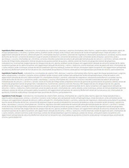 Frutos rojos Ingredientes: maltodextrina, monohidrato de creatina 13,6%, dextrosa, hidrocloruro de L-arginina, beta-alanina, agente de carga (polidextrosa), alfa-cetoglutarato de L-arginina, aromas, L-citrulina, L-tirosina, ácido málico, sales cálcicas de ácido ortofosfórico, citrato de sodio, ácido comestible (ácido cítrico), antiaglomerante (dióxido de silicio), cafeína anhidra 1,1%, clorhidrato de acetil-L-carnitina, carbonato de magnesio, edulcorantes (acesulfamo K, sucralosa), taurina, extracto de hojas de té verde, concentrado de remolacha roja en polvo [maltodextrine, concentré de betterave, acide comestible (acide citrique)], L-glutamina, ácido L-ascórbico, L-leucina, clorhidrato de L-ornitina, regulador de la acidez (carbonatos de sodio), β-hidroxi β-metilbutirato cálcico, L-carnitina-L-tartrato, extracto de hoja de Ginkgo biloba, preparado de extracto de semilla de guaraná (extracto de guaraná, cafeína), extracto de rizoma de jengibre (extracto de jengibre, maltodextrina), nicotinamida, bisglicinato de zinc [bisglycinate de zinc, glycine, acidifiant (acide citrique), anti-agglomérant (dioxyde de silicium)], acetato de DL-alfa-tocoferol [acétate de DL-alpha-tocophérol, anti-agglomérant (dioxyde de silicium)], L-valina, L-isoleucina, bitartrato de colina, extracto de pepitas de uva, clorhidrato de L-lisina, betaína, colorante (carmín), ácido nicotínico, acetato de retinilo [stabilisant (gomme arabique), acétate de rétinyle, antioxydant (alpha-tocophérol), anti-agglomérant (phosphates de calcium)], extracto de frutos de pimienta negra BioPerine®, clorhidrato de piridoxina, D-biotina, ácido pteroil-monoglutámico, picolinato de cromo, cianocobalamina.