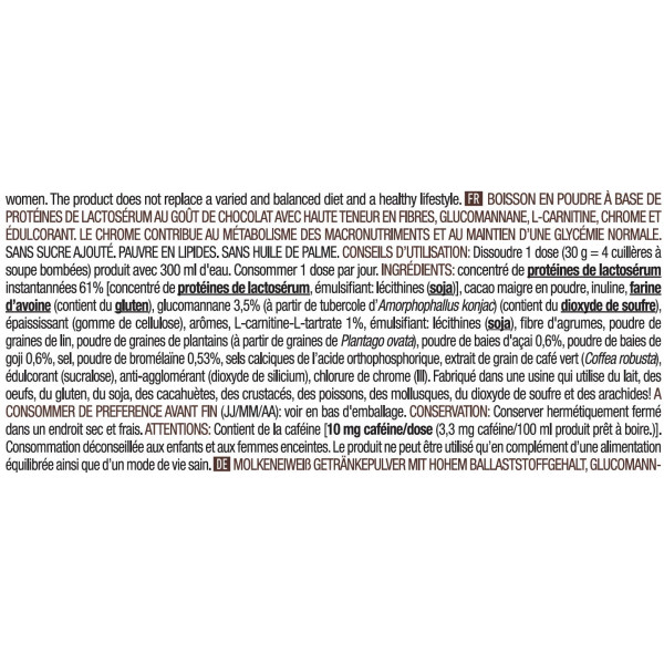 Ingredientes Chocolate : concentrado de proteínas suero de leche instant 61% [concentrado de proteínas de suero de leche, emulgente: lecitinas (soja)], cacao en polvo bajo en grasas, inulina, avena (contiene gluten), glucomanano 3,5% (del tubérculo Amorphophallus konjac) (contiene dióxido de azufre), espesante (goma de celulosa), aromas, L-carnitina-L-tartrato 1%, emulgente: lecitinas (soja), fibra de cítricos, polvo de semillas de lino, polvo de semillas de llantén (de semillas de Plantago ovata), polvo de bayas de acai 0,6%, polvo de bayas de goji 0,6%, sal, bromelina en polvo 0,53%, sales cálcicas de ácido ortofosfórico, extracto de grano de café verde (Coffea robusta), edulcorante (sucralosa), antiaglomerante (dióxido de silicio), cloruro de cromo (III).